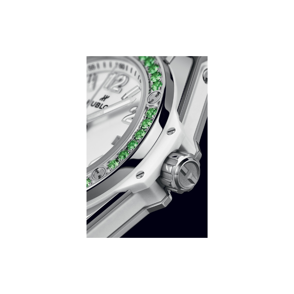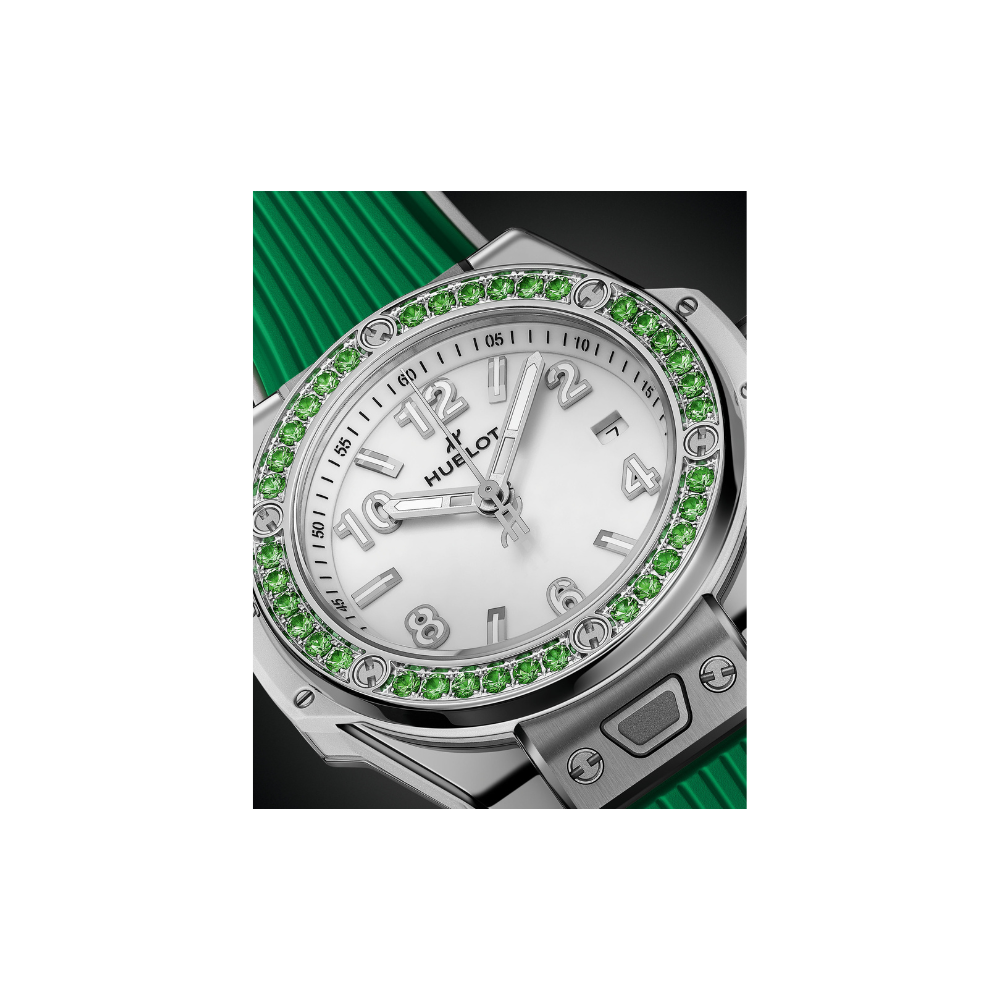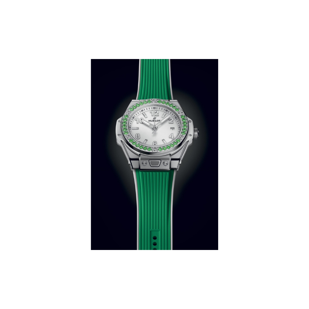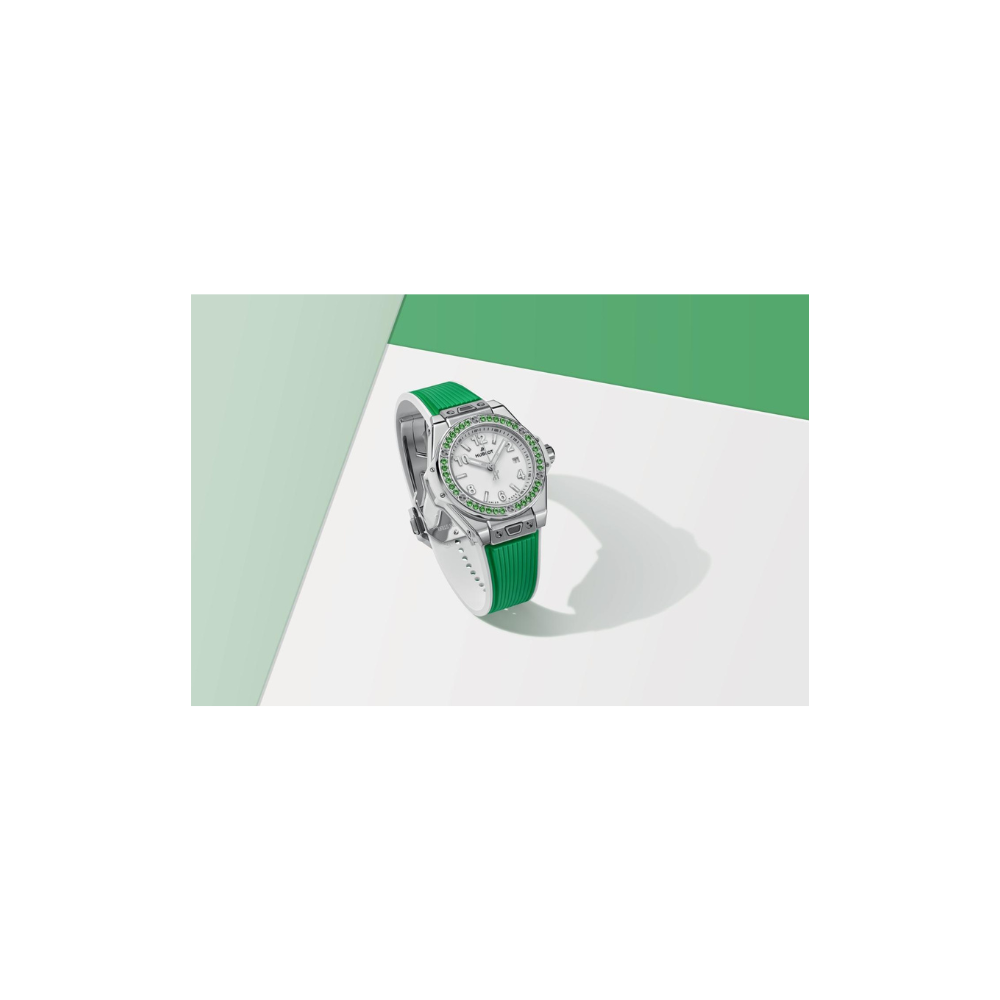 The Hublot Big Bang One Click Apple Green 33mm is a bold and vibrant luxury timepiece designed for confident, style-forward women. Crafted in polished stainless steel with a 33mm case, this Swiss-made watch features a striking apple green sunray dial, delivering a fresh and contemporary look.