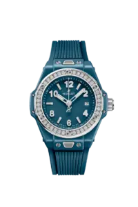 Elegant, bold, and radiant β the Hublot Big Bang One Click 33mm in petrol blue ceramic is a true statement of style. The bezel is set with 36 diamonds, adding refined sparkle to the sporty, polished design.