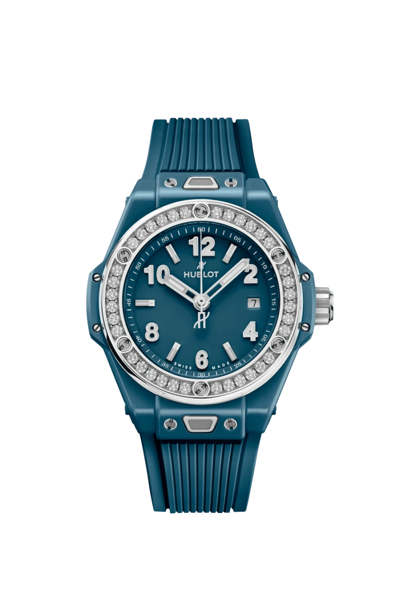 Powered by a self-winding movement with a 40-hour power reserve, and paired with a matching blue strap via Hublotβs One Click system for easy swaps.