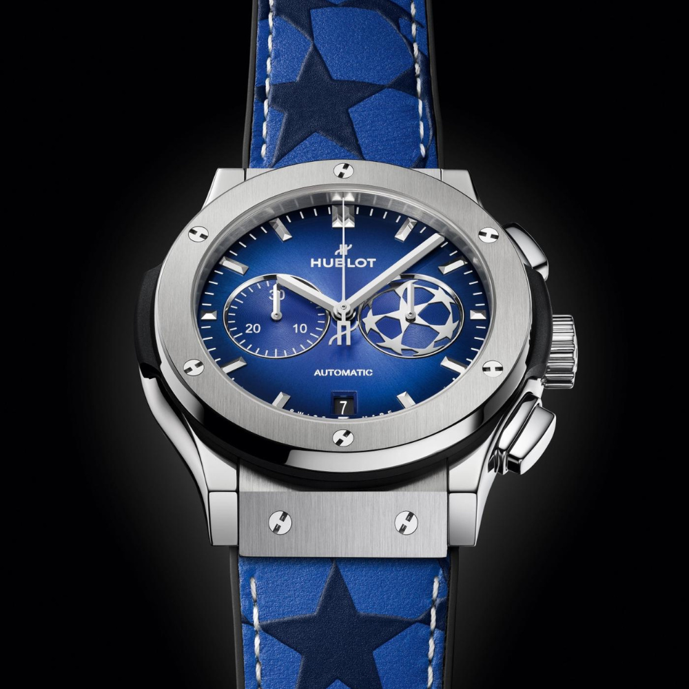 Blue sunray satin-finished dial with UEFA Champions League logo