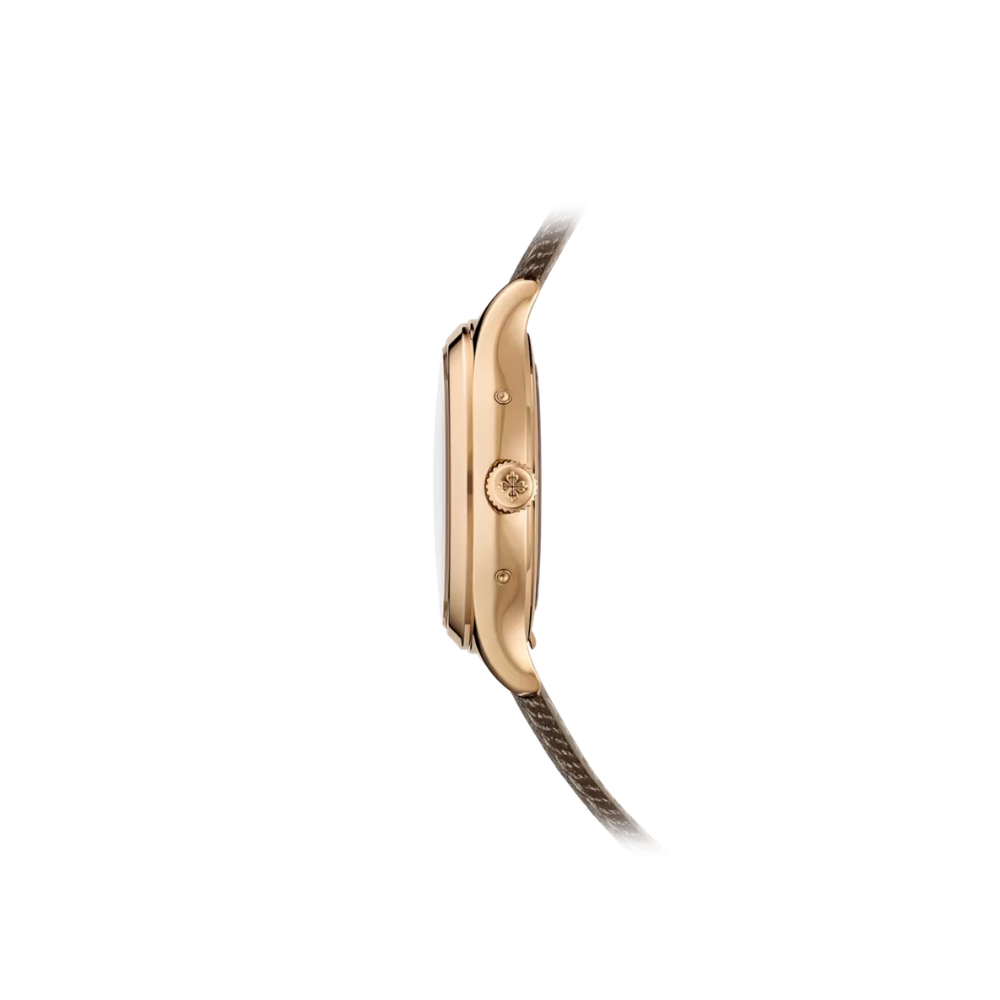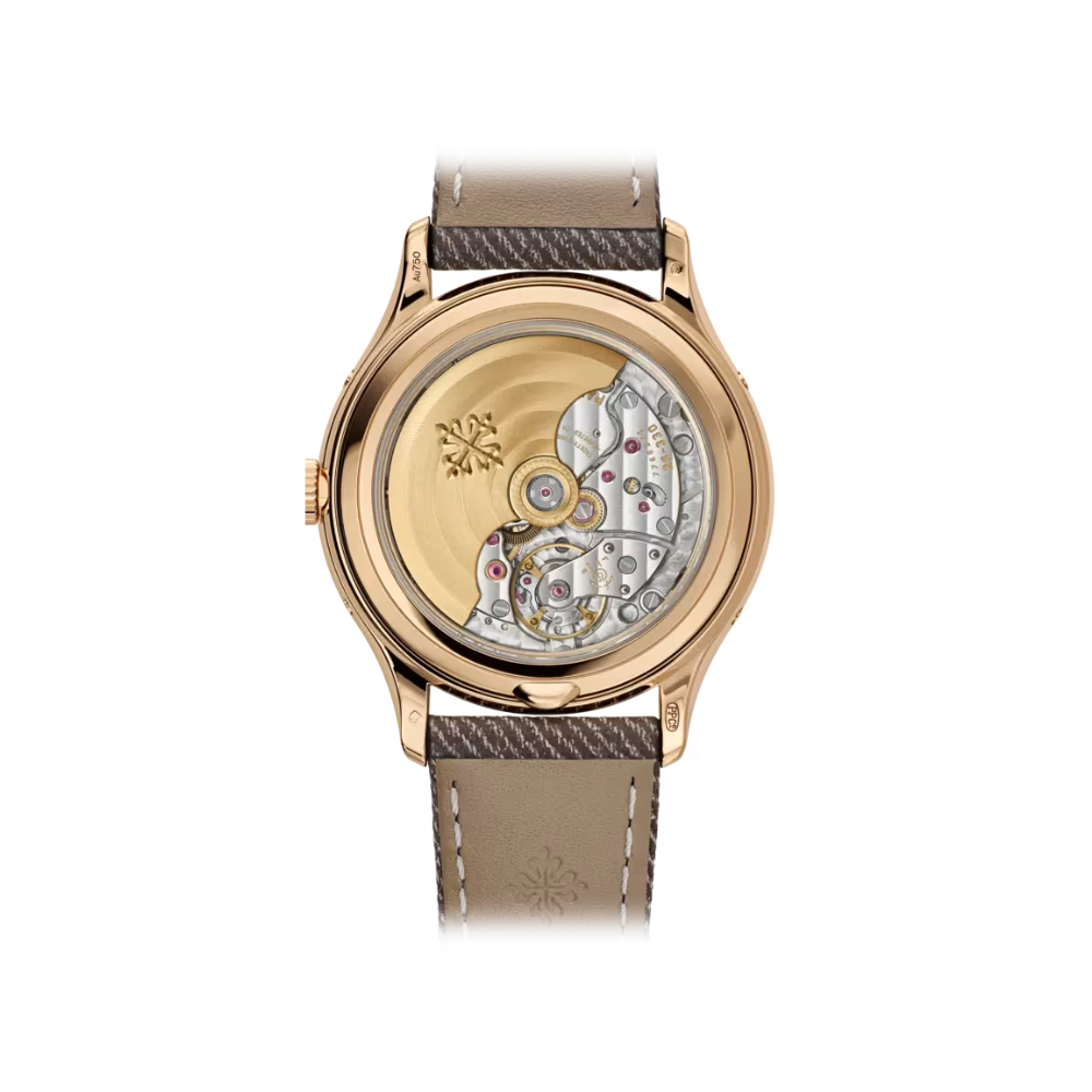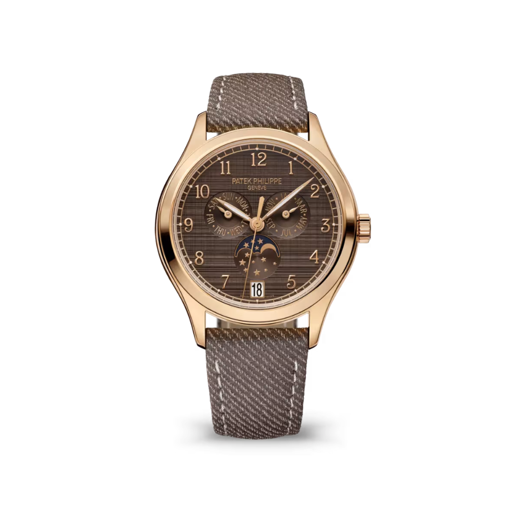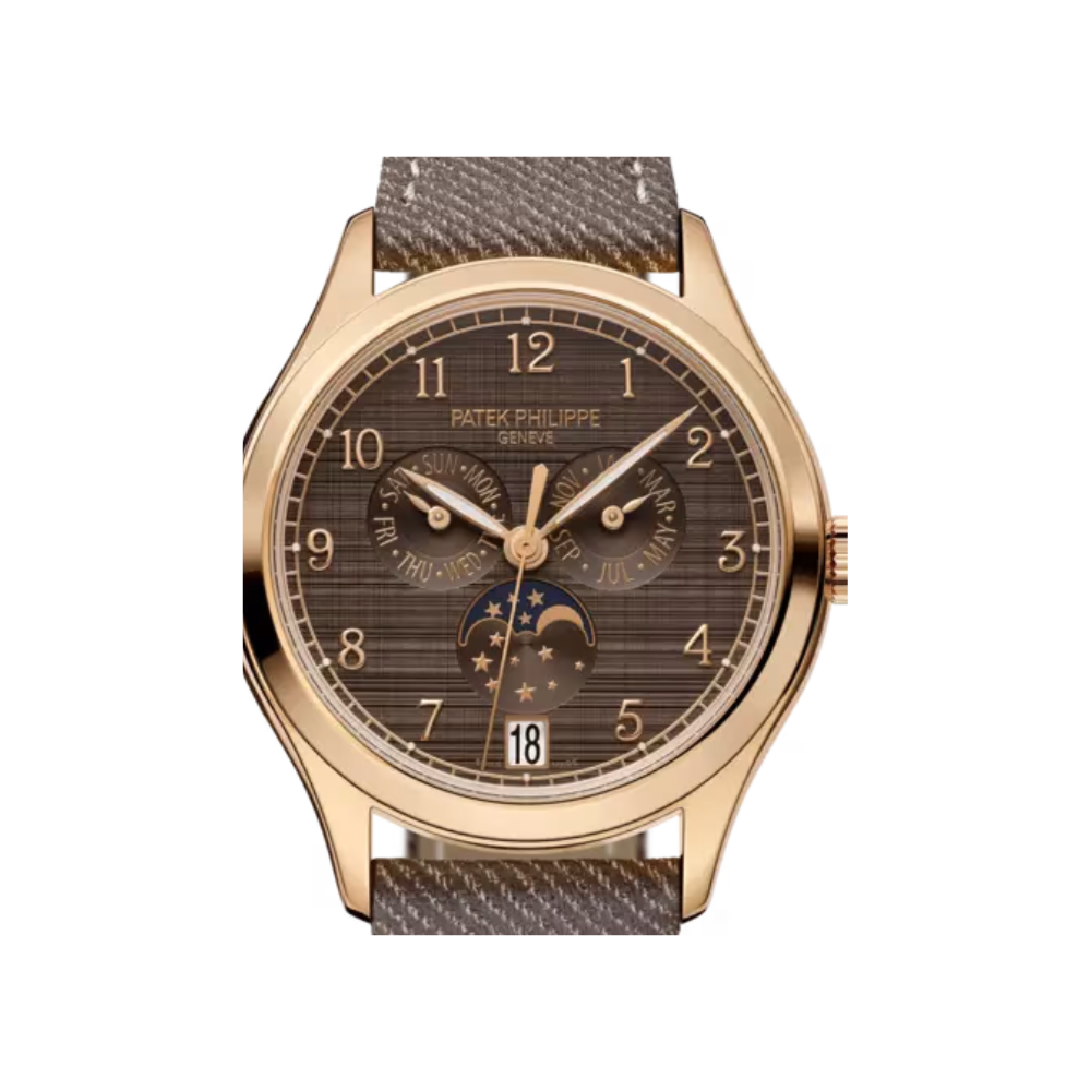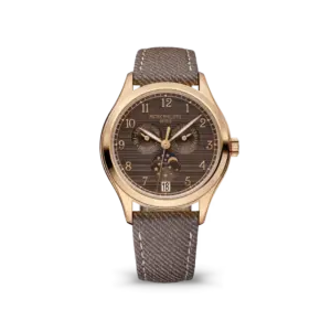 The Patek Philippe Complications Ref. 4946R-001 is a refined timepiece that exemplifies the brand’s mastery of horology. Encased in 38mm 18K rose gold, this watch balances classic elegance with contemporary sophistication, making it suitable for both formal occasions and everyday luxury. Its chestnut brown dial features a unique satin-brushed texture, adding depth and subtle visual interest, while rose gold leaf-shaped hands and applied numerals provide clarity and understated elegance.