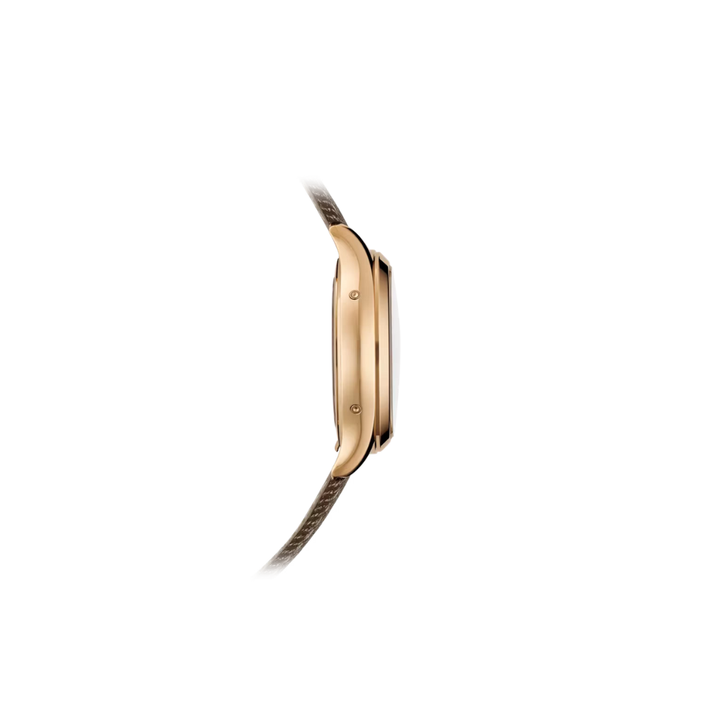 Strap: Brown calfskin strap with contrasting cream stitching, fastened by a rose gold prong buckle, ensuring comfort and elegance.