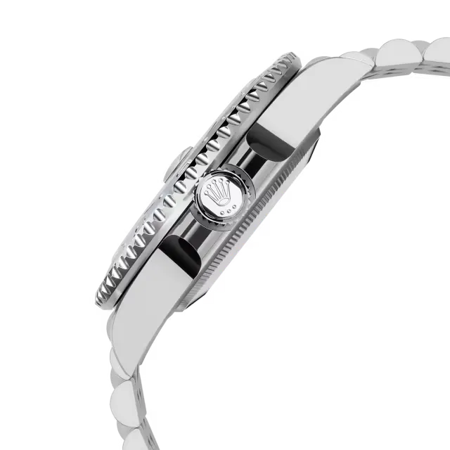 Encased in robust 40 mm Oystersteel, the watch is paired with a solid-link Oyster bracelet, offering both durability and comfort. The black lacquered dial features Chromalight-coated hour markers and Mercedes-style hands, ensuring high legibility in all conditions, while the blue GMT hand and rotating bezel allow tracking of two time zones simultaneously. A Cyclops-lensed date window at 3 o’clock adds practicality without compromising design.