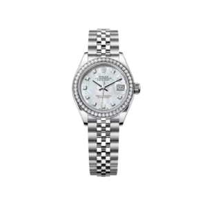 The Lady-Datejust 28 Ref. 279384RBR-0011 is more than a timepiece—it is a jewel of horology. With its shimmering mother-of-pearl dial, diamond hour markers, and diamond-set bezel, it radiates sophistication while offering Rolex’s legendary precision and reliability. Perfect for women who desire timeless elegance with modern performance, this watch is both a statement of style and a lasting investment in Swiss excellence.