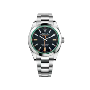 The Rolex Milgauss Ref. M116400GV-0001 stands as one of Rolex’s most distinctive and iconic models, designed with the unique ability to resist magnetic fields of up to 1,000 gauss—hence the name “Mille” (thousand) and “Gauss” (magnetic field unit). First introduced in 1956 for scientists, engineers, and medical professionals working in high-magnetic environments, the Milgauss has since become a symbol of technical mastery blended with bold style.