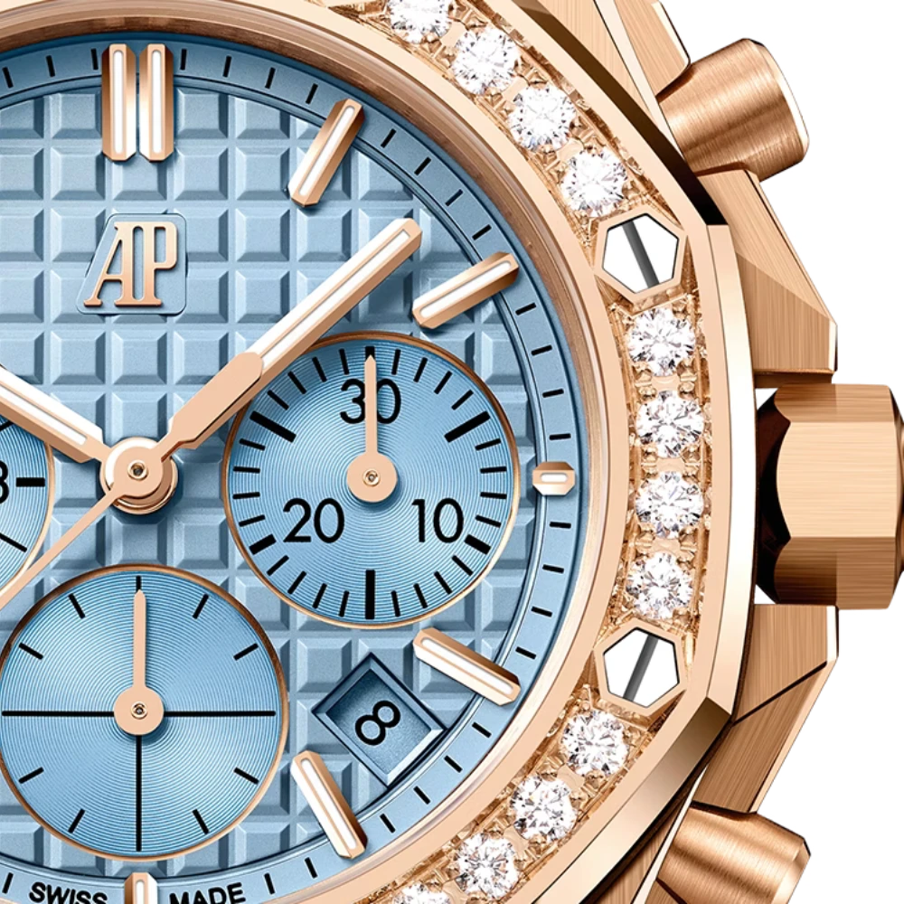 Crafted in a robust 37 mm stainless steel case, the watch features the iconic octagonal bezel, now enhanced with 32 brilliant-cut diamonds (~1.024 carats) for a radiant sparkle. The salmon-toned dial is decorated with the signature “Lady Tapisserie” pattern, offering depth and visual intrigue. White gold applied hour markers and luminescent Royal Oak hands ensure legibility in all conditions.