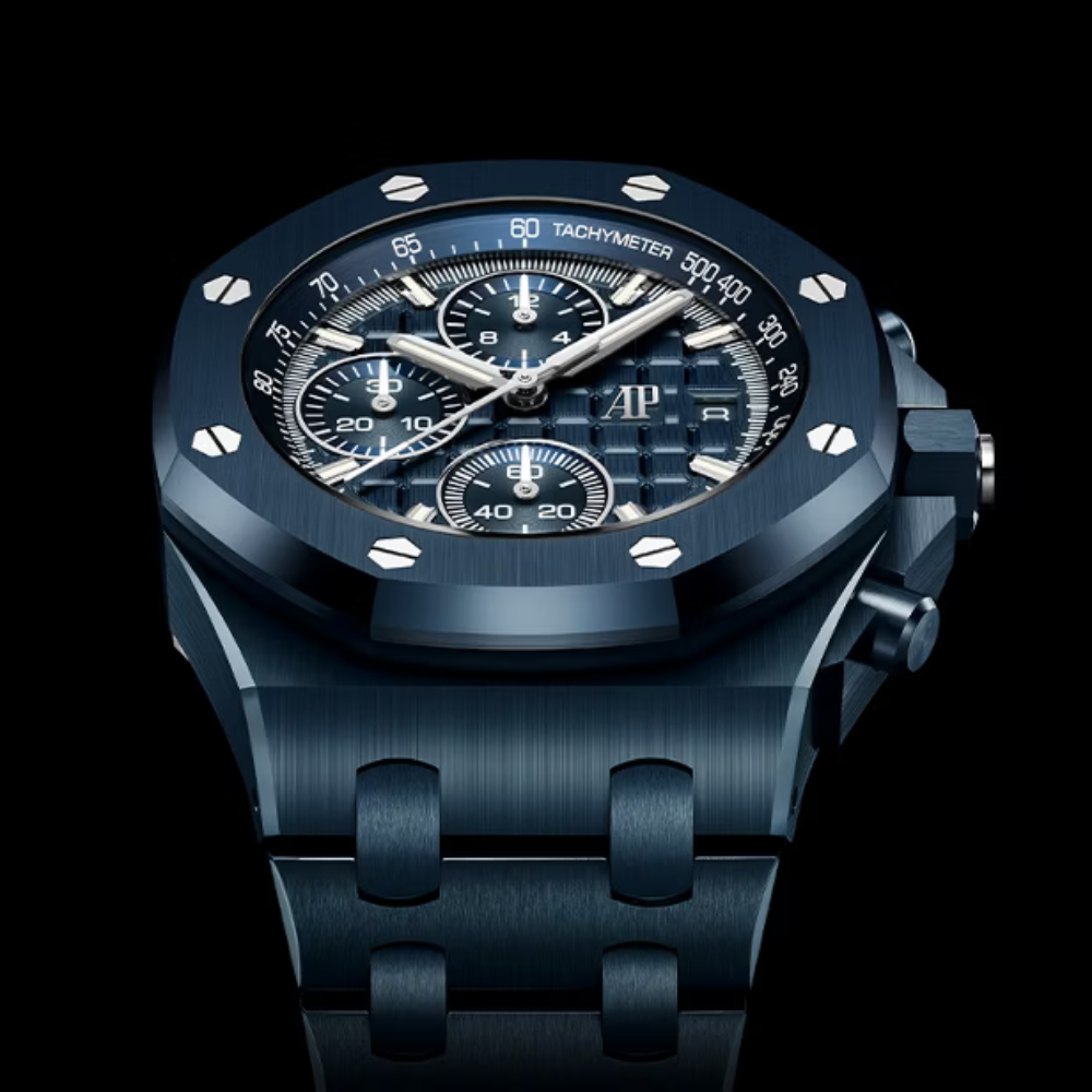 Completing the look is an integrated ceramic bracelet in Bleu Nuit, secured by a folding clasp in titanium — combining comfort, stealth luxe, and technical sophistication. The Royal Oak Offshore 26238CD is ideal for enthusiasts who demand material innovation, design legacy, and mechanical excellence in one commanding statement piece.